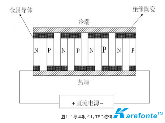 半导体制冷又称电子制冷,或者温差电制冷,是从50年代发展起来的一门介于制冷技术和半导体技术边缘的学科,与压缩式制冷和吸收式制冷并称为世界三大制冷方式。半导体制冷器的基本器件是热电偶对,并合理的使用了导热陶瓷片,把一只N型半导体和一只P型半导体连接成热电偶(如下图),通上直流电后,在接口处就会产生温差和热量的转移。在电路上串联起若干对半导体热电偶对,而传热方面是并联的,这样就构成了一个常见的制冷热电堆。借助于热交换器等各种传热手段,是热电堆的热端不断散热并且保持一定的温度,而把热电堆的冷端放到工作环境中去吸热降温,这就是半导体制冷的原理。